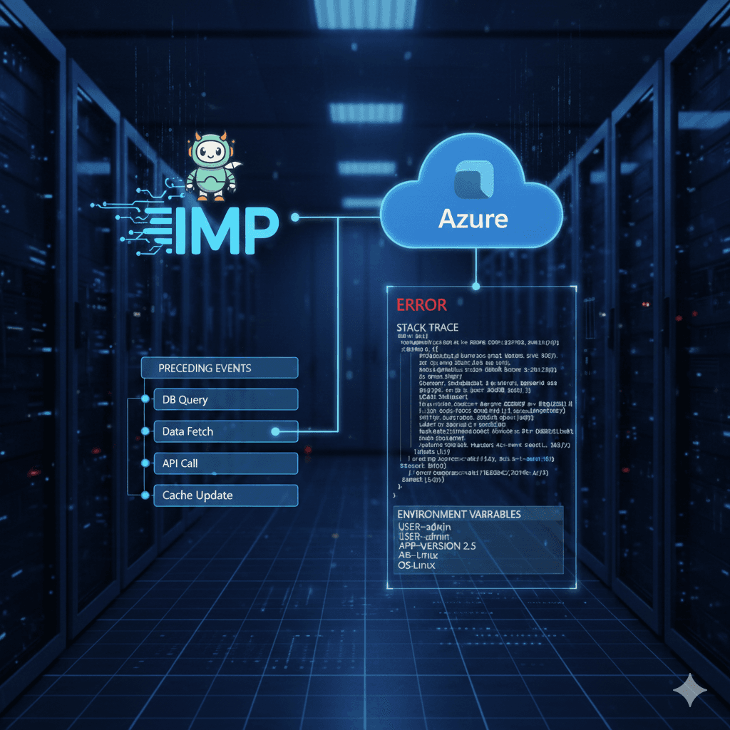 Imp securely connects to your Azure telemetry. It doesn't just see the error; it captures the stack trace, environment variables, and the preceding events that led to the crash.